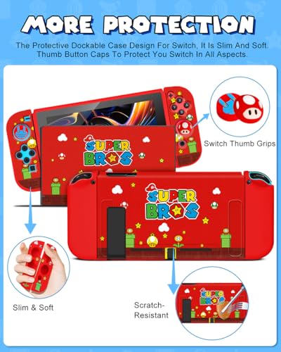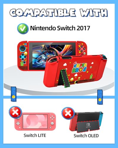 🎮【Compatibility】Please Note that Super Bros Skin for Nintendo Switch Protective Case is Only Compatible with Nintendo Switch 2017 (Not Suitable for OLED and Lite versions). The Switch protective case is dockable, slim, and soft, it won’t scratch your game console. The fun silicone joystick caps can protect your original joystick covers from corrosion and peeling, and enhance your gaming experience. The carrying bag for Nintendo Switch Accessories in the bundle is universal.