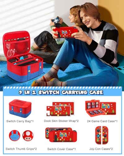 🎮【9 IN 1 Switch Accessories Bundle】This red blue super bros Switch Carrying Case Accessories Bundle includes: a cute character large Switch Travel Protective Bag*1, Switch dockable skin shell*1, Joy-Con covers*2, 24 game card holder organizer*1, cute thumb grips joystick controller button caps*2, and a dock sticker wrap*2. This for Nintendo Switch game traveler deluxe travel case set meets all your basic needs for Switch stuff.