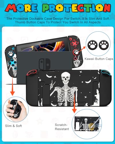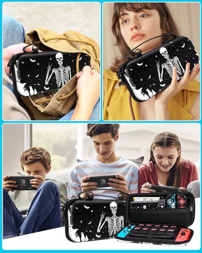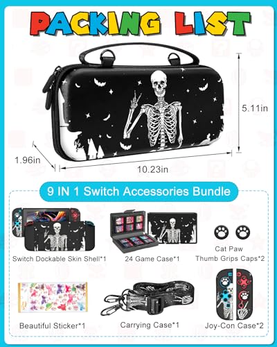 9in1 Skull Skeleton Switch Case for Nintendo Switch Carrying Cases & Storage Accessories Bundle Kit Thumb Grips+Game Holder+Dockable Skin+Shoulder Strap+Sticker for Switch Travel Pouch Bag