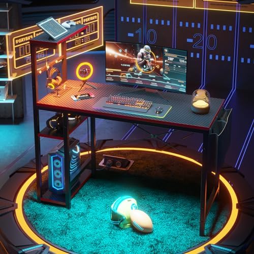 【Stylish Black 3D Carbon Fiber Finish & CARB P2 Class Board】: The gaming table desk features a sleek 3D carbon fiber finish, adding a touch of modern style to your bedroom or gaming room. It’s not just a pc table, but a statement of your gaming passion. The carbon fiber gaming desk is made with CARB P2 Class Board, which is a premium-quality material standing for California Air Resource Board
