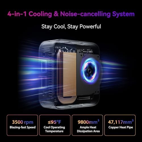 Efficient Cooling System, Dual WIFI & Lifetime Technical Support – MP80 mini desktop computer comes with 4-in-1 cooling & noise-cancelling system and active noise-canceling technology, ultra-quiet, 2.4GHz/5.0GHz dual band WiFi and offers speeds up to 450Mbps on the 2.4GHz band & 1300Mbps on the 5GHz, ensures stable,high-speed data transfers.