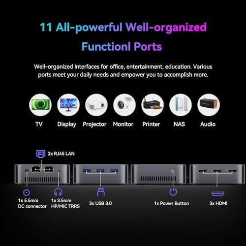 Versatile Connectivity & VESA Bracket Design- MP80 mini computer features high-precision integrated body, 11 All-powerful ports, well-organized interfaces for office, entertainment, education, easy to connect multiple devices like servers, monitoring equipment, projectors, televisions, etc. (3x USB 3.0, 3x HDMI, 2x Gigabit Ethernet Ports, 1x 3.5mm HP/MIC TRRS, 1x 5.5mm DC connector, 1x Power). Our complimentary VESA bracket can mount the small PC on the wall or on the monitor.