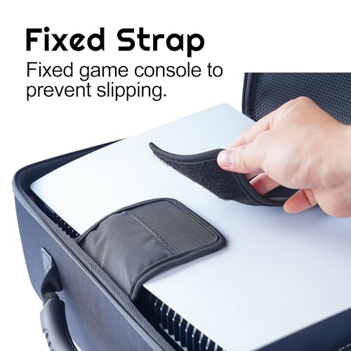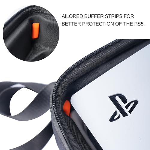 · 𝗠𝘂𝗹𝘁𝗶𝗽𝗹𝗲 𝗰𝗮𝗿𝗿𝘆𝗶𝗻𝗴 𝗺𝗲𝘁𝗵𝗼𝗱𝘀 𝗳𝗼𝗿 𝗘𝗮𝘀𝘆 𝗖𝗮𝗿𝗿𝘆𝗶𝗻𝗴 – Carrying case for PS5 is designed with a soft handle, you can carry it easily. And comes with adjustable shoulder strap, you can adjust the length to your own fit and carry it by shoulder. Make it more comfortable to use. You can easily take your PS5 console and accessories with you on trips at any time.