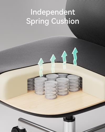 【Comfort & Ventilated】This office chair is comprised of a cushion with a 3.54-inch spring, memory foam, curved wooden boards, and black mesh covering. It has 16 independent springs and a 1.18-inch memory foam with just the right softness to maintain its shape even after extended use, and is as relaxing as a sofa. The breathable mesh fabric prevents sweating after prolonged sitting. The soft and highly flexible cushion spring will provide you lasting support through long periods of sitting.