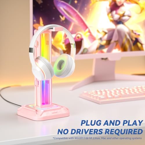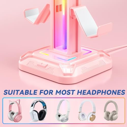 KDD RGB Headset Stand with 9 Light Modes – Controller Holder for Desk – Rotatable Headphone Stand & Detachable Controller Hook for PC Earphone Accessories(Pink)