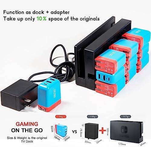 【3-in-1 Switch Dock, Small but Powerful】Built-in smart protection GaN chipset protects your device from overcurrent, overheating and overvoltage. The Portable Switch dock makes the adapter ideal for carrying around or traveling, and it neatly replaces the official dock and separate charger. Only 10% size of official dock and separate charger, very small and portable.