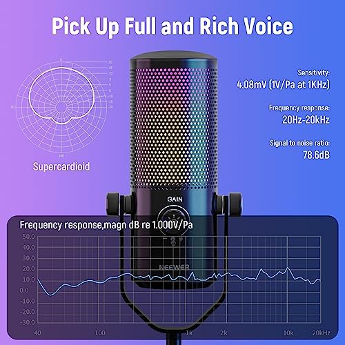Neewer USB Gaming Microphone with RGB Light Effect, Plug & Play One Click Mute & Gain, for PC Mac PS4 PS5, Cardioid Condenser Mic for Twitch Streaming Game Podcasts, Online Chat and More, CM24