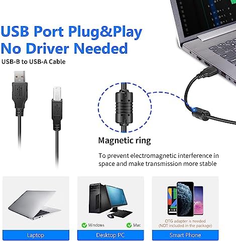 【Compatibility】The 78.7in/2m USB B to USB A cable with a magnetic ring design is plug and play ready for recording work or gaming on PCs. It offers stable transmission, less interference and lower power consumption. Compatible with laptops, desktop PCs (for Windows and Mac), and smartphones with OTG adapter (not included)