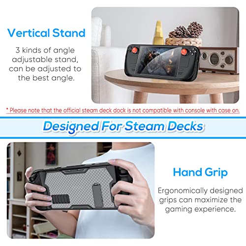 [Free Your Hands, Enjoy Every Moment] Integrate shockproof case and Zinc alloy kickstand with 3 adjustable angles allow you to find your best view preventing back, neck, and wrist pain. We strike a balance between protection and ultra-slim style. So you can easily slip it in and out of your official carrying case (* Please Note: the official steam deck dock is not compatible with console with case on)