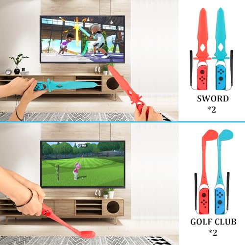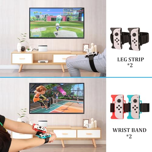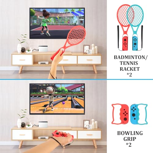【More Realistic Gameplay Experience】Golf clubs are designed for Switch Sport: Mario Golf Super Rush. Sword grips for games: Chambara, Pokemon Sword and The Legend of Zelda. Rackets are ergonomically sized and shaped to simulate real tennis and badminton swings, are used for Switch Sports Badminton, Switch Sports Tennis & Mario Tennis Aces. Wrist Bands for volleyball. Leg straps for Switch Sport Soccer. Baseball bats for Switch Sport Baseball. Bowling grips for Switch Bowling game.