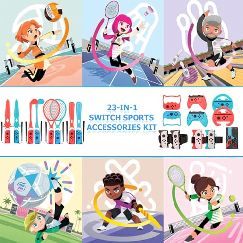 【23 in 1 Accessories Kit】The complete kit includes: 2*Golf Clubs, 2*Rackets, 2*Sword, 2*Wrist Bands, 2*Leg Straps, 2*Bowling Grips, 2*Baseball Bats, 2*Joy-Con Grips, 2*Steering Wheels, 4*Thumb Caps, 1*Game Cartridge. This kit is designed for the latest Swtich Sports Games, includes mario golf super rush, mario tennis, soccer, volleyball, bowling, badminton, Chambara (Swordplay) and other switch games, can meet your different needs and save your time and money comparing various accessories.