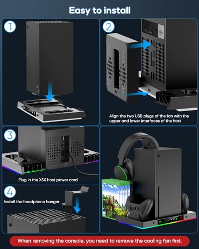 【Easy installation and Minimalist Storage】—- Simply align the two USB ports on the fan with the USB ports of the stand and the console to install. After installation,pls checking if the connection is successful, otherwise it will not work.The Charger station for Xbox X provides gamers with 8 disc holders for game discs and 2 slots for expansion cards. It also comes with a headphone holder, the minimalist design keeps gaming accessories organized and the desktop clean.
