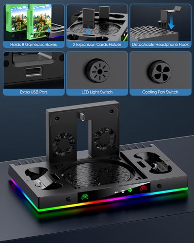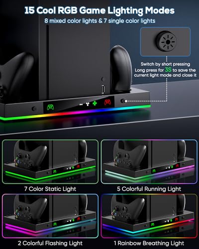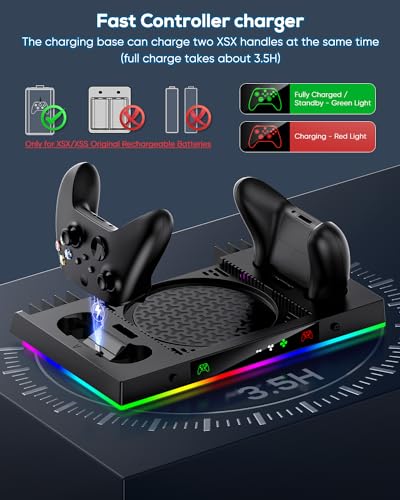 Upgrade Cooling Fan & Dual Charging Stand for Xbox Series X Console & Controller,Cooler Charger Station System for Series X with 15 RGB Lights,2 x 1400mAh Rechargeable Battery,Disc Accessories Storage
