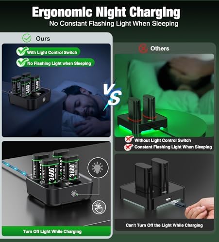 🌟【Nighttime Charging Mode】When you are trying to sleep in the same dark room. You don’t have to unplug the charger overnight to avid this constantly flashing LED. Just one tap on the touch control switch, you can sleep without LED light disturbance while charging the batteries.