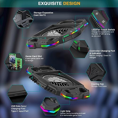 【ALL-IN-ONE COOLING STAND】Wiilkac newest version of cooling stand fit for Xbox Series X uses a more complete, all-in-one design to provide all the extra features you need. As it builts-in charging ports and charging docks to charge your console and controllers. 6Pcs game cards slot to storage. Meanwhile, This cooling fan stand comes with a unique cooling system and multiple effects of RGB bottom light to dissipate heat for your console and make your gaming experience comfortable and easier.