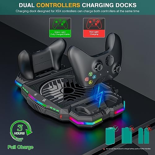 Vertical Cooling Fan Stand and Dual Controller Charging Station for Xbox Series X with RGB Color Lights/USB Ports, 3-Level Fan Cooling System with 2 x 1400 mAh Rechargeable Battery