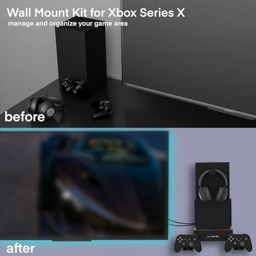 Wall Mount with Cooling Fan for Xbox Series X, 4 in 1 Wall Mount Kit for Xbox Series X, 3 Speed Low Noise Fan with RGB Light Strip & Touch Switch, 3 USB Port Controller & Headphone Holder