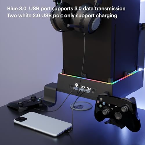 【3.0 USB & 2.0 USB Charge Port】There are 3 USB ports on cooling fan bracket, 1 blue 3.0 USB port supports 3.0 data transmission, and 2 white 2.0 sub-ports only support charging, which can charge more products, such as controller, desk lamps, phones, etc. Cooling stand for xbox series x can charge your controller or phone next to your TV or display, or connect your controller when you playing the game,1 wall mount to meet all your needs.