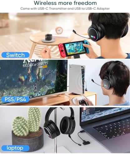 【3 Connection Modes】2.4GHz Transmitter Mode, this professional gaming headset is plug-and-play with a 2.4G USB-C transmitter and USB-to-USB-C adapter, perfect for PS5, PS4, Switch, Tablet, Laptop, Mac, TV. You can also connect to your phone or laptop in Bluetooth mode for hands-free calls or music listening. Wired Mode, Comes with a 3.5mm audio cable for connecting more devices.