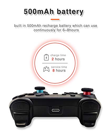 High-speed charging and High battery life This switch has a built-in 500mAh rechargeable battery, which can play 6-8 hours continuously after full charged via Type C cable for 2 hours.